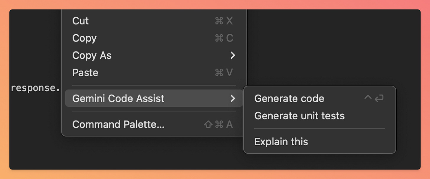 Gemini supports generating Unit Tests - I couldn’t use it in my current code base because the unit tests setup isn’t there, but this feature is visible (& hopefully useful in many other applications) in the top toolbar and right-click menu.